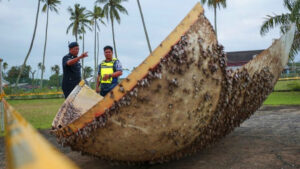 এন এস বি ডেস্ক: মালয়েশিয়ায় গভীর সমুদ্রের ঢেউয়ে ভেসে এলো বিশালাকৃতির এক রহস্যময় বস্তু। প্রাথমিক পর্যবেক্ষণে বিশেষজ্ঞদের ধারণা, এটি মহাকাশ থেকে ছিটকে পড়া কোনো যান বা রকেটের ধ্বংসাবশেষ। মালয়েশিয়ার পেকান জেলার নেনাসি উপকূলের কামপুং তানজুং সমুদ্রসৈকতে বস্তুটি পাওয়া যায়, যা বর্তমানে গোটা এলাকায় ব্যাপক কৌতূহল ও রহস্যের সৃষ্টি করেছে।