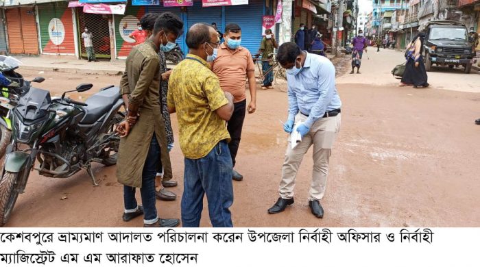 আ.শ.ম এহসানুল হোসেন তাইফুর, কেশবপুর থেকে: কেশবপুরে সরকার ঘোষিত বিধি-নিষেধ অমান্যকারী ব্যক্তিদের অর্থদন্ড দিয়েছেন ভ্রাম্যমাণ আদালত। গত শুক্রবার ও শনিবার পৌর শহরসহ উপজেলার বিভিন্ন স্থানে ভ্রাম্যমাণ আদালত পরিচালনা করেন উপজেলা